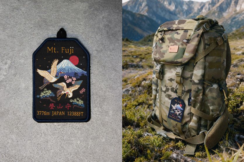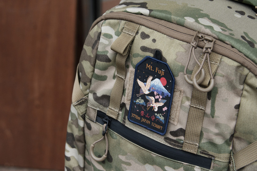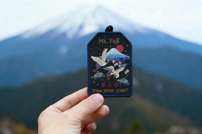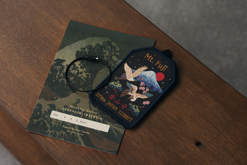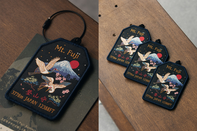 Supply Section 設計,2026 年富士登頂章以《 浮世繪 》與日本傳統刺繡風格為發想,畫面中有雙鶴標誌、櫻花與松,並標示富士山的 3776 公尺與 12388 英尺海拔,本款紀念章以「織繡」技法加工,圖像精細美麗。2026 富士登頂紀念章首次加入「登山守」 功能,除了以御守外型設計之外,上方的繩環可透過附上的帶鎖金屬環將登山守鉤在背包上!